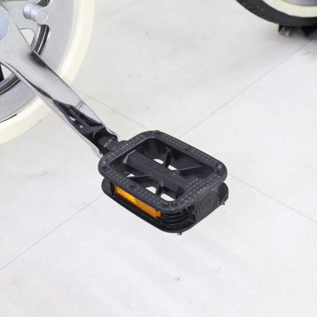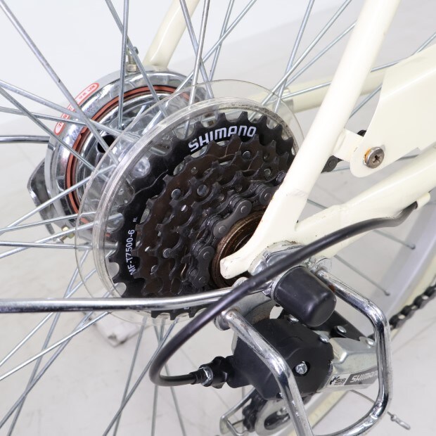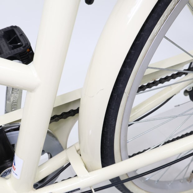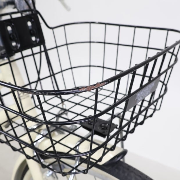 一部に傷や錆やスレがありますが、比較的状態の良い車体です。前カゴ、リング錠が後付けされています。ダイナモライトがオートライトに交換されています。