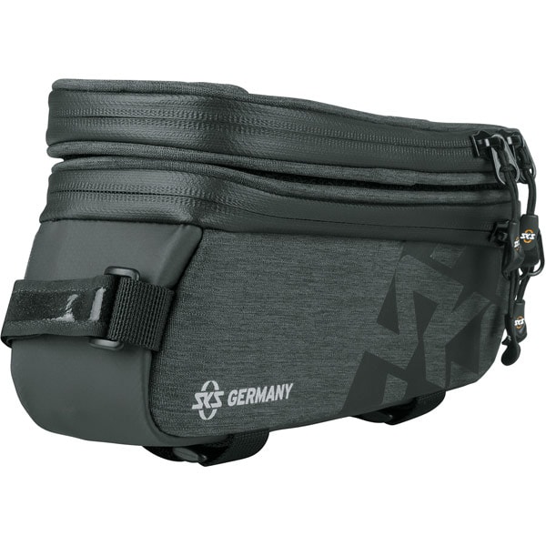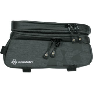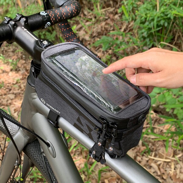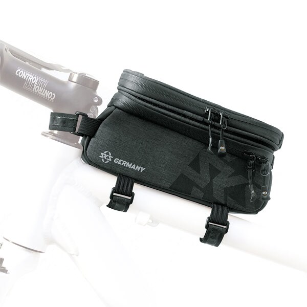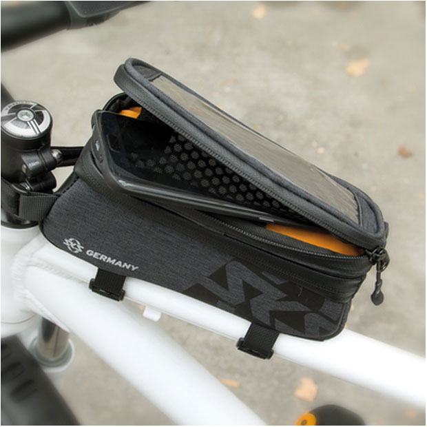 着脱可能なスマートフォンポーチ付の小型トップチューブバッグ。
