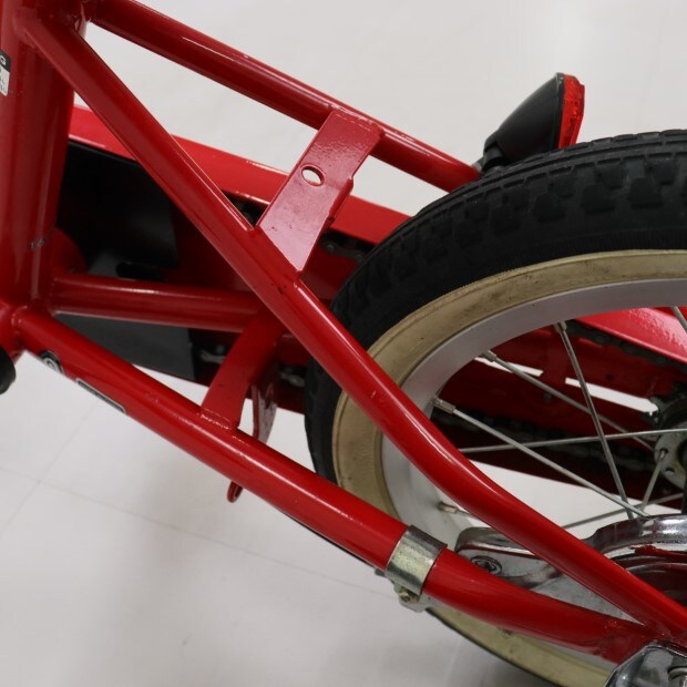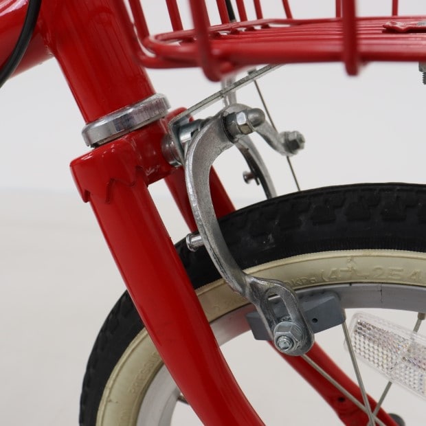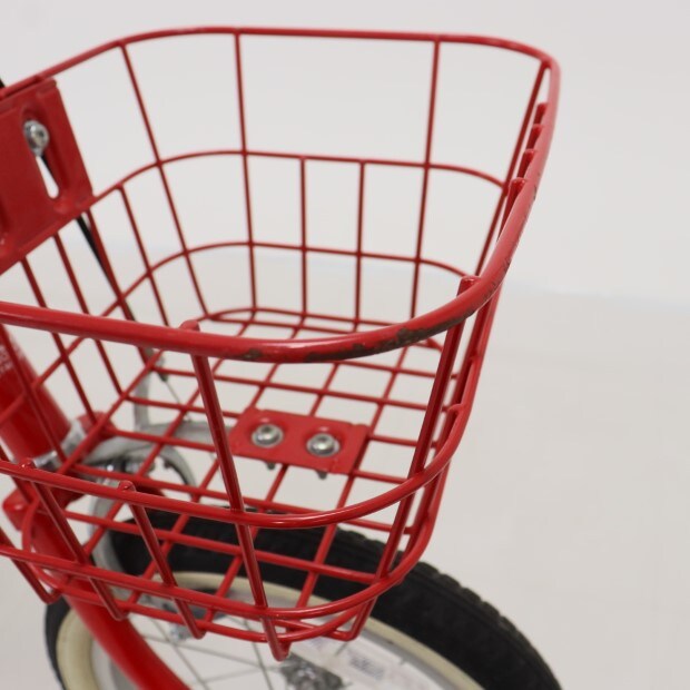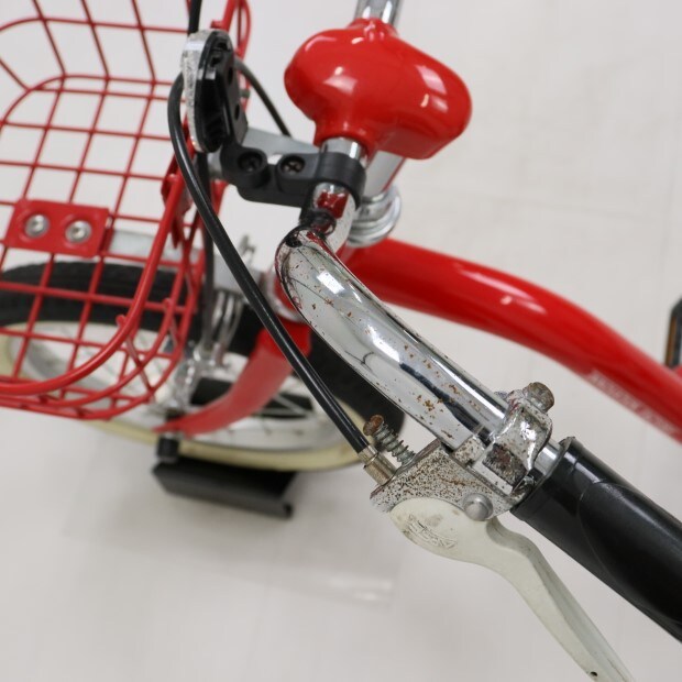 一部に傷がありますが、比較的状態の良い車体です。補助輪がスタンドに交換されています。前カゴが後付けされています。