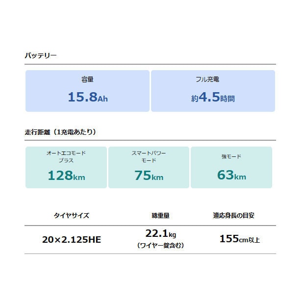 | 一充電走行距離?(注2) | 強モード:63km スマートパワーモード:75km オートエコモード:128km |