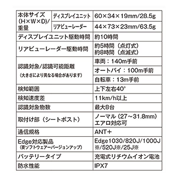 | 認識可能距離 | 車両・最大140m後方から バイク・最大100m後方から 自転車・最大13m後方から |
