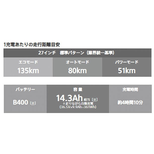 | 1充電あたりの走行距離の目安(標準パターン・バッテリー新品時) | エコモード:135km オートモード:80km パワーモード:51km |