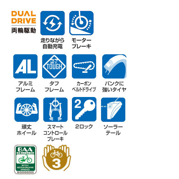DUAL DRIVE(両輪駆動)モデルは、チェーンではなく、カーボンベルト。だから、サビない、はずれない。しかもチェーンの5倍以上長持ち。