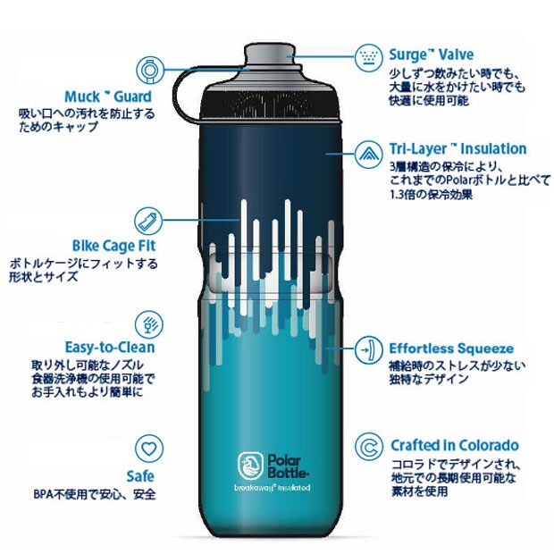 • ・飲み口の内側に「Surge Valve(サージバルブ)」を採用しており、バルブを上に引き上げた状態でボトルを逆さにしても中の液体が漏れず、ボトルを握り込むことで中のドリンクが出てくる仕組み。