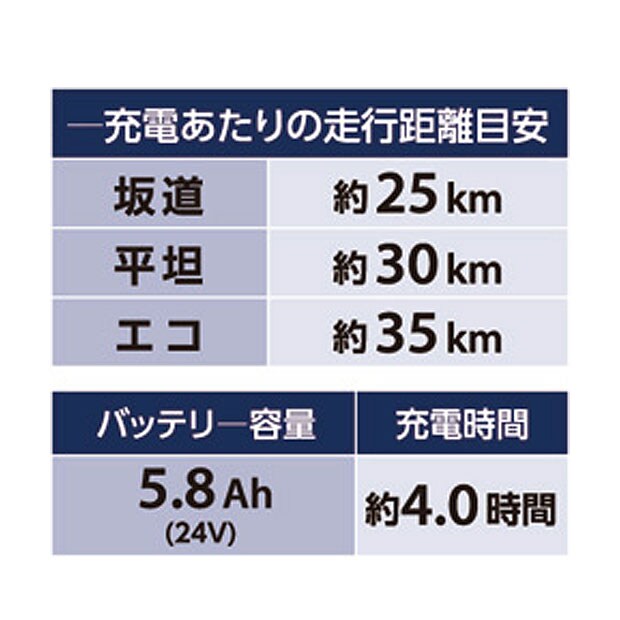 | 一充電あたりの走行距離目安 | 坂道:約25km 平坦:約30km エコ:約35km |