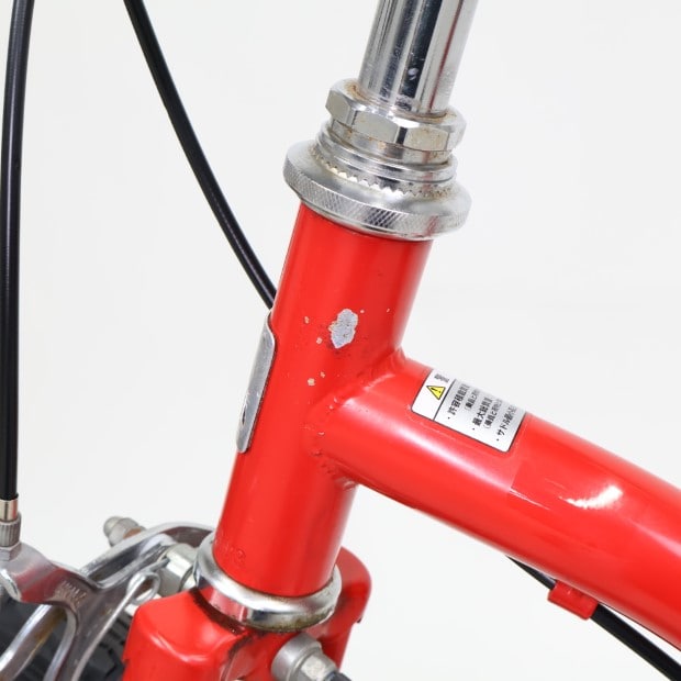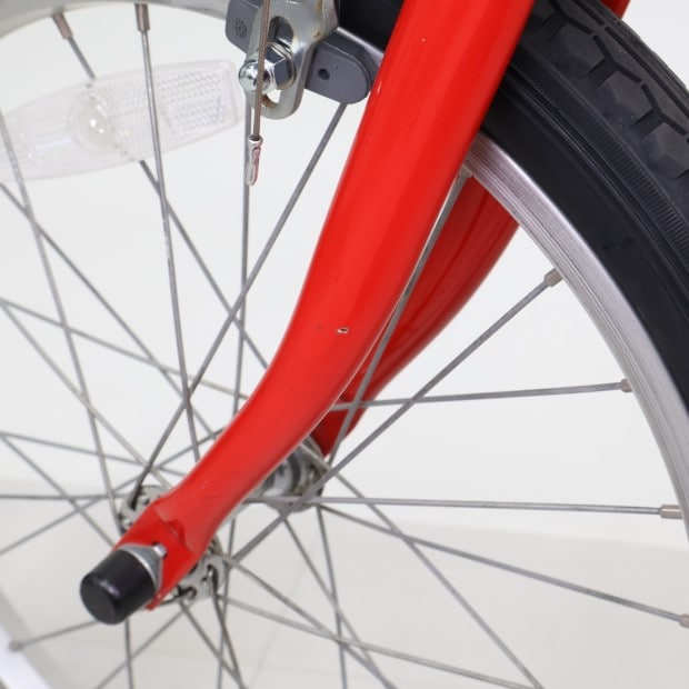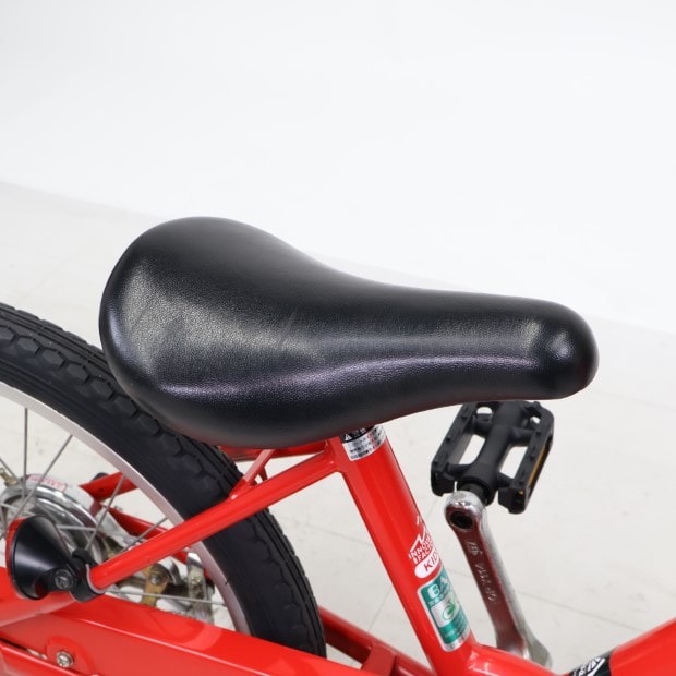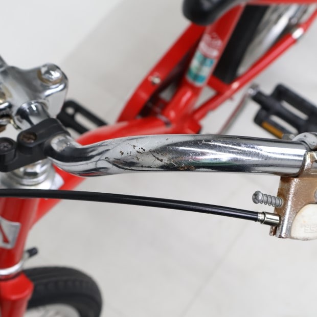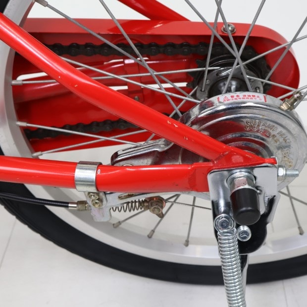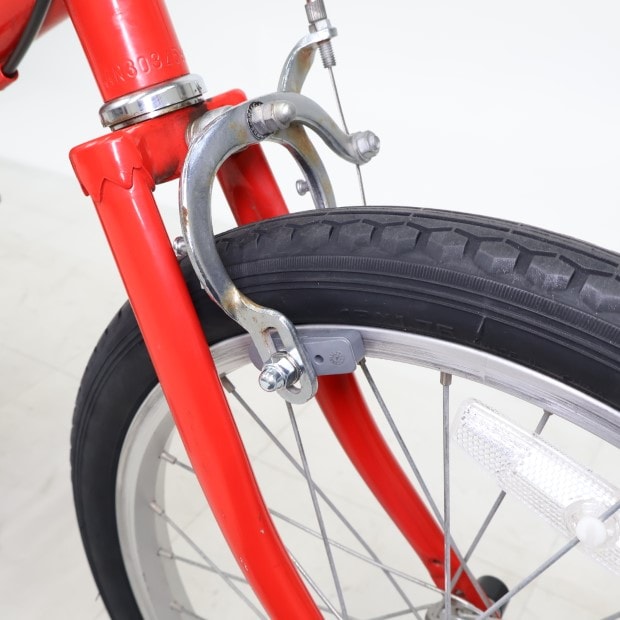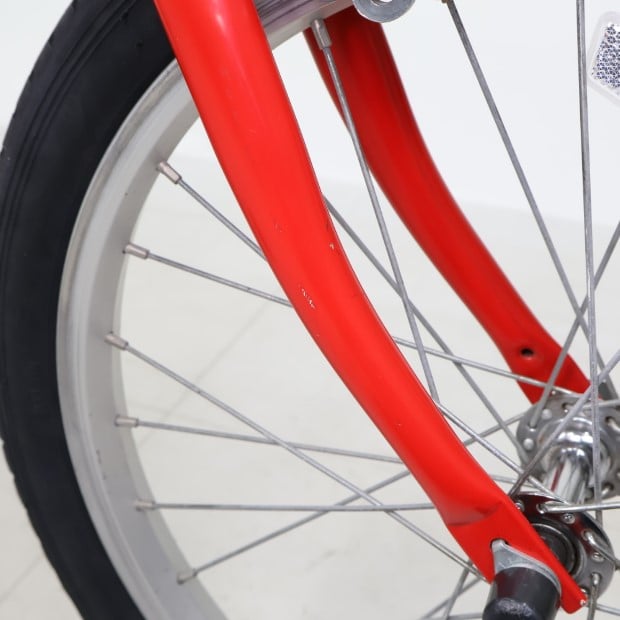 一部に傷や錆がありますが、比較的状態の良い車体です。補助輪がスタンドに交換されています。ステムキャップ欠損。
