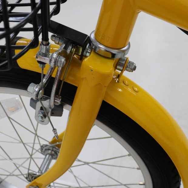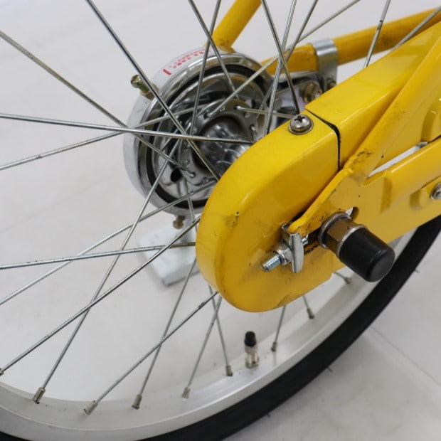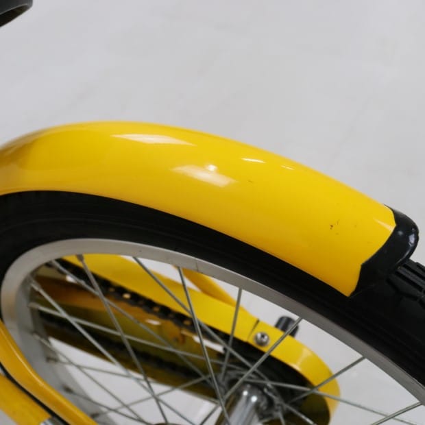 一部に傷や錆がありますが、比較的状態の良い車体です。補助輪がスタンドに交換されています。前カゴ、泥除けが後付けされています。