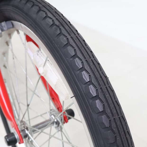 一部に傷や錆がありますが、比較的状態の良い車体です。前カゴ、前後泥除けが後付けされています。補助輪がスタンドに交換されています。
