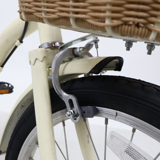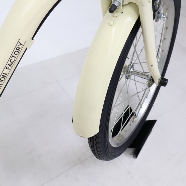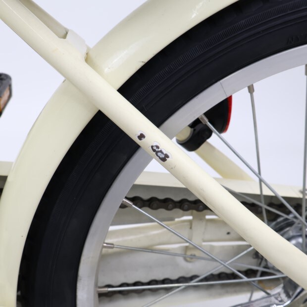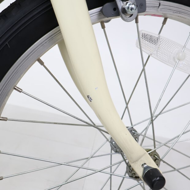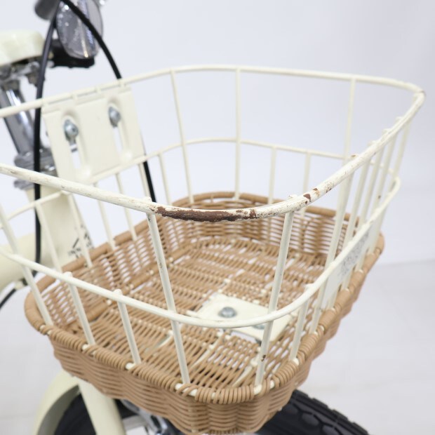 傷、錆あり。前カゴ、前後泥除けが後付けされています。補助輪がスタンドに交換されています。