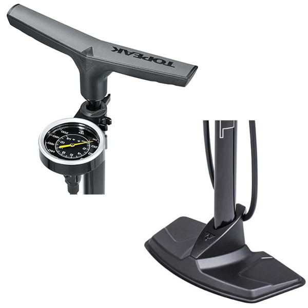 高い位置にマウントされた大型エアーゲージ、安定したポンピングを可能にするワイドスチールベース、切り替え無しで米式と仏式に対応するスマートヘッドDX3を備えたプロ仕様ポンプ、「ジョーブロープロX」。