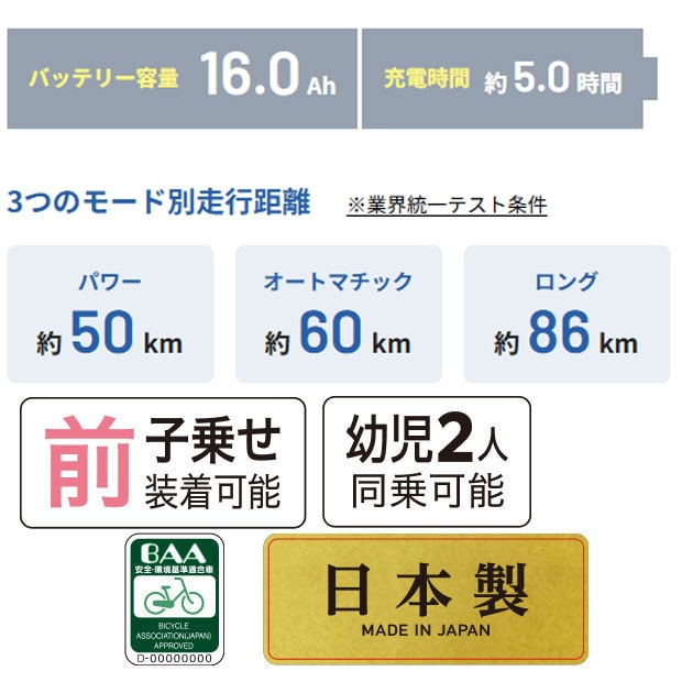 | 充電1回の走行距離(標準パターン) | 約50km※(アシストモード:「パワー」使用時) |