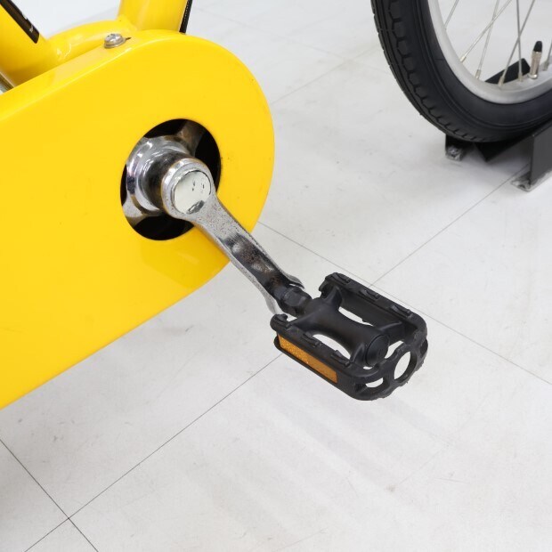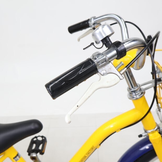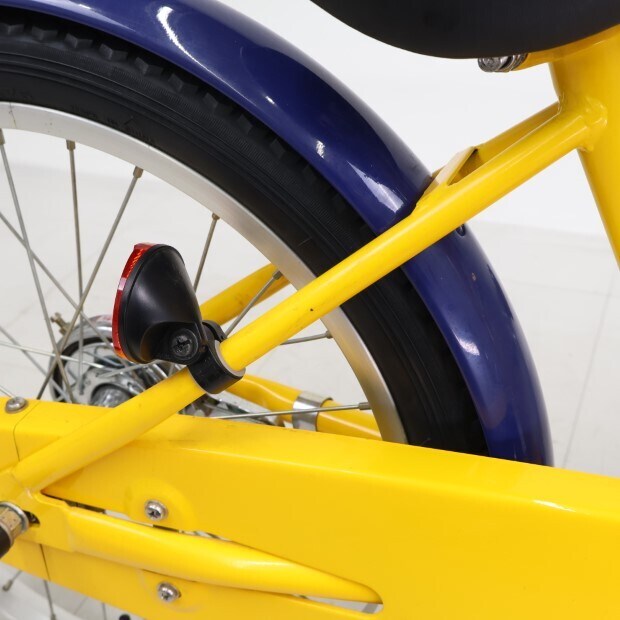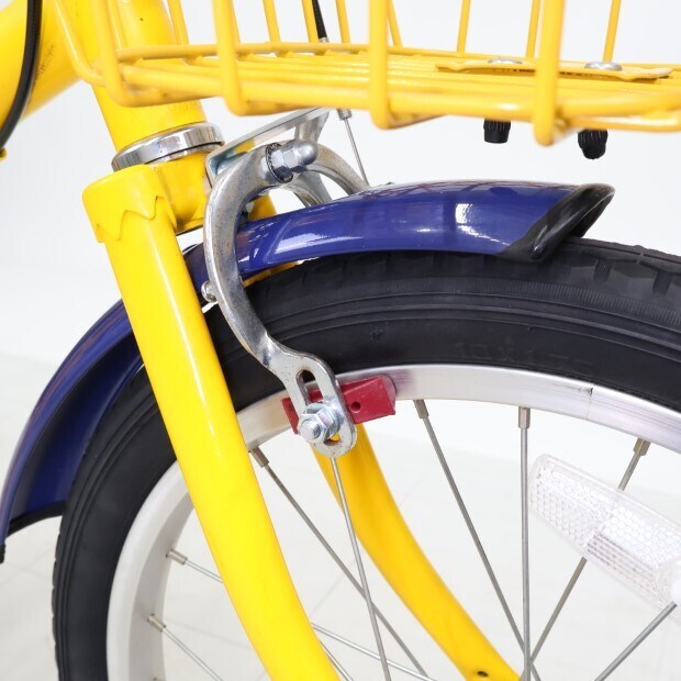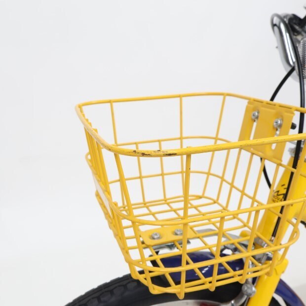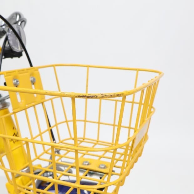 一部に傷や錆やスレがありますが、比較的状態の良い車体です。前カゴ、前後泥除けが後付けされています。補助輪がスタンドに交換されています。