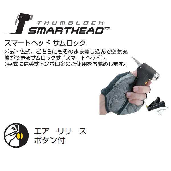 米式・仏式、どちらにもそのまま差し込んで空気充填ができるサムロック式「スマートヘッド」。