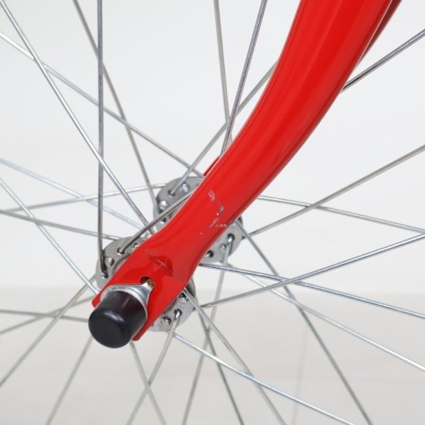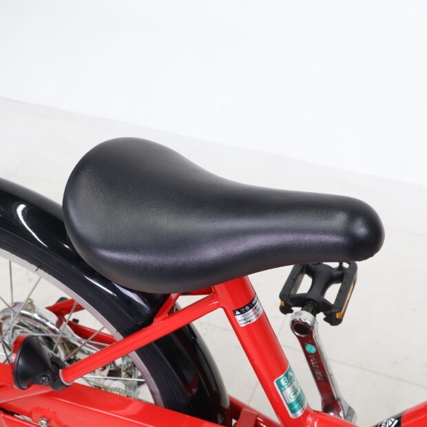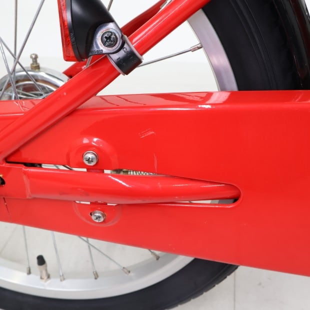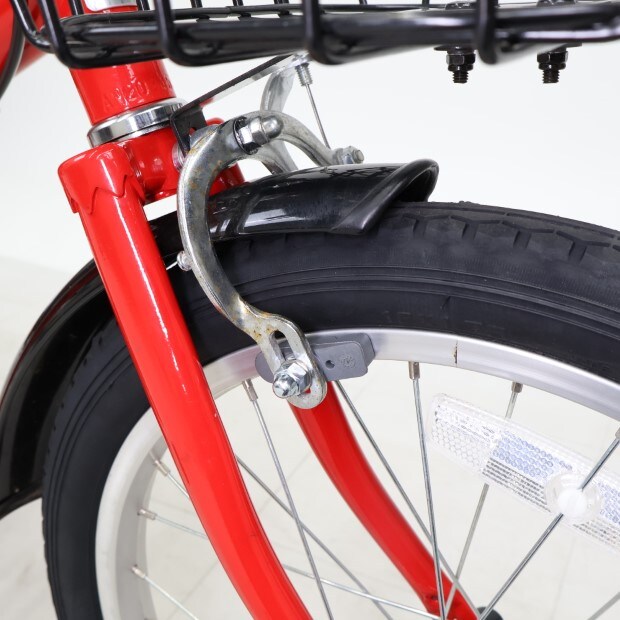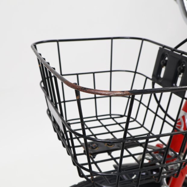 一部に傷や錆がありますが、比較的状態の良い車体です。補助輪がスタンドに交換されています。前カゴ、前後泥除けが後付けされています。