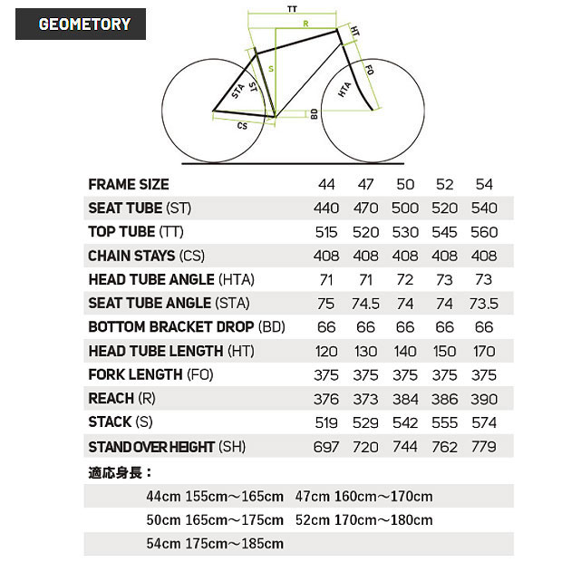 | 適応身長 | 155~165cm(44cm XXS) 160~170cm(47cm XS) 165~175cm(50cm S) 170~180cm(52cm SM) 175~185cm(54cm ML) |