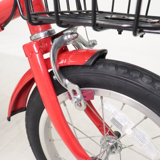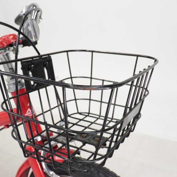 一部に傷や錆がありますが、比較的状態の良い車体です。前カゴ、前後泥除けが後付けされています。補助輪がスタンドに交換されています。