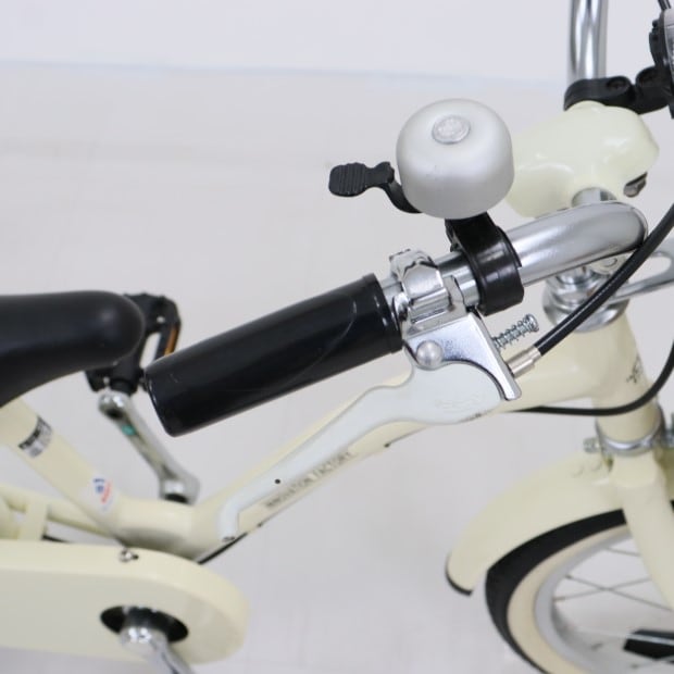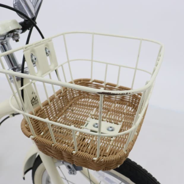 一部に傷や錆がありますが、比較的状態の良い車体です。補助輪がスタンドに交換されています。前カゴ、泥除けが後付けされています。