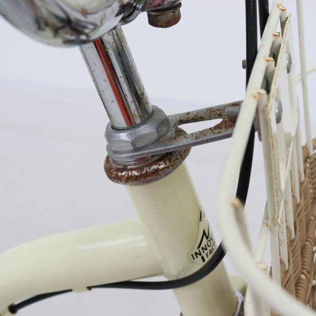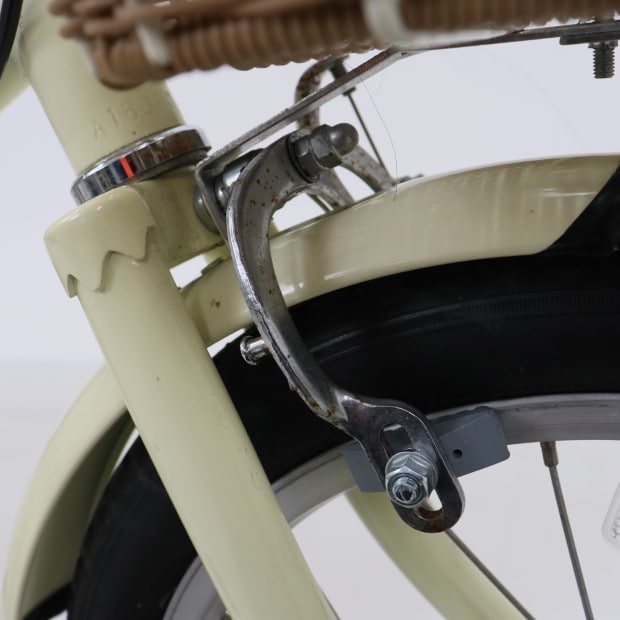傷、錆あり。補助輪がスタンドに交換されています。前カゴ、泥除けが後付けされています。