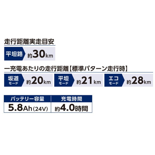 | 走行距離 | 20km(坂道)、21km(平坦)、28km(エコ) |