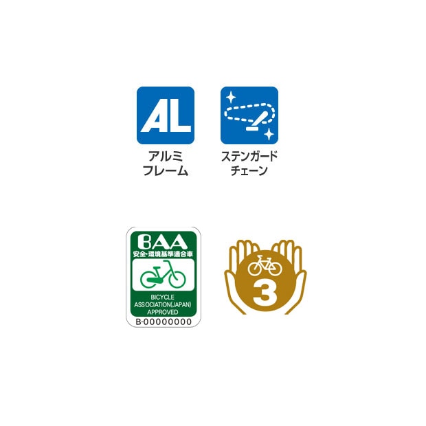 一般社団法人自転車協会が制定した安全・環境基準適合車です。 ブリヂストンの自転車および電動アシスト自転車はBAA(自転車協会制定)で要求される基準より さらに厳しい独自の安全基準を制定しています。