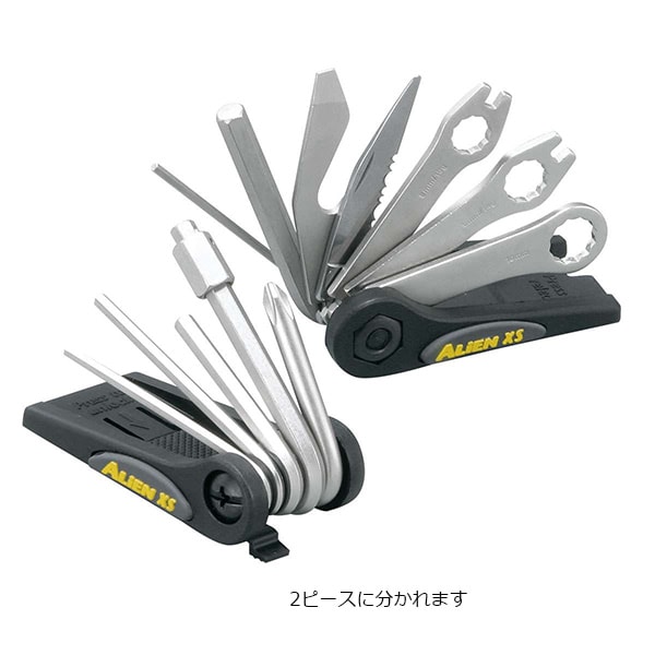 基本工具に加えて、スポークレンチ、メガネレンチ、ナイフ、栓抜きを装備する16機能の携帯ツール。2ピースに分かれます。