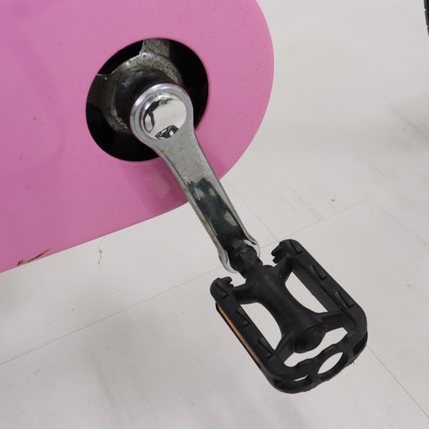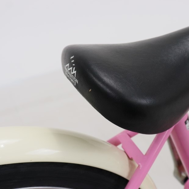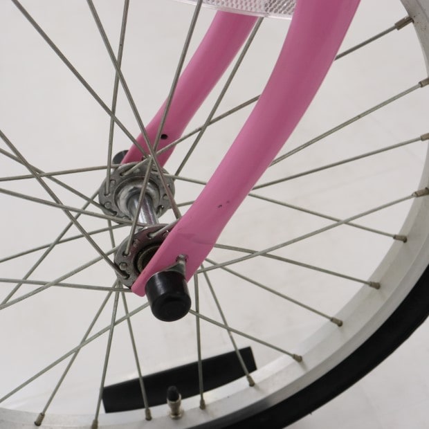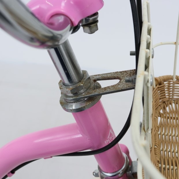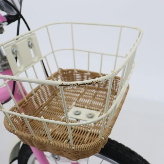 傷、錆あり。補助輪がスタンドに交換されています。前カゴ、泥除けが後付けされています。