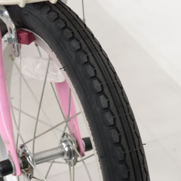 一部に傷や錆がありますが、比較的状態の良い車体です。前かご、前後泥除けが後付けされています。補助輪がスタンドに交換されています。
