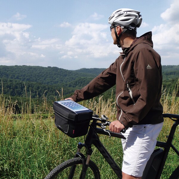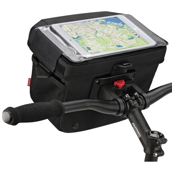 中身に合わせて折り込める、タッチ可能なマップ&タブレットケース(防水)が付いたフロントバッグ、アベンツアー プロ。