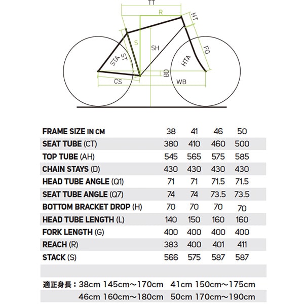 | 適正身長 | 145〜170cm(38cm)、150〜175cm(41cm)、160〜180cm(46cm)、170〜190cm(50cm) |