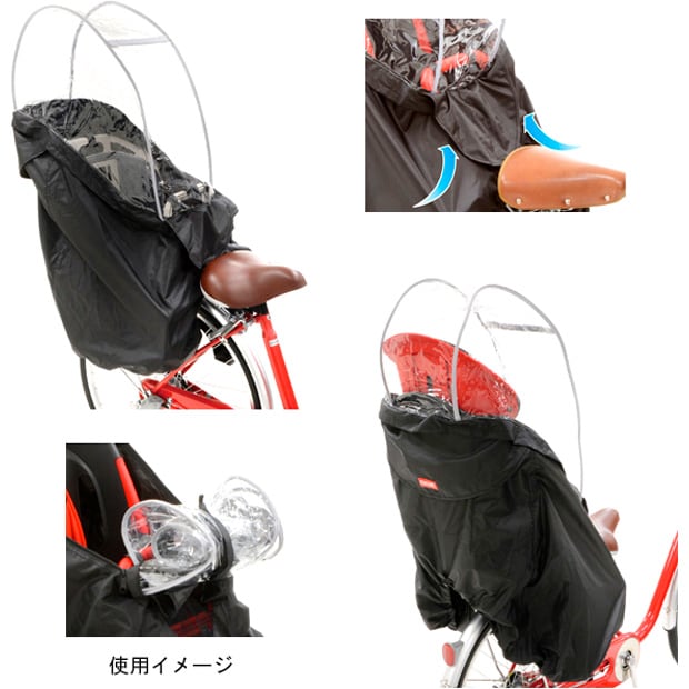 ヘッドレストのない子供のせにも対応、芯材を強化したことにより形状保持力アップした折りたたみもラクなうしろ子供のせ用風防レインカバー。