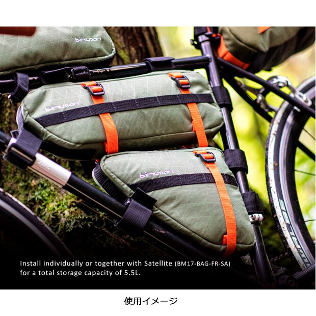 撥水・耐摩耗素材使用した3Lのフレームバッグ「パックマントラベルフレームパック-プラネット」。ベルクロ留めでフレームに取り付けが可能です。