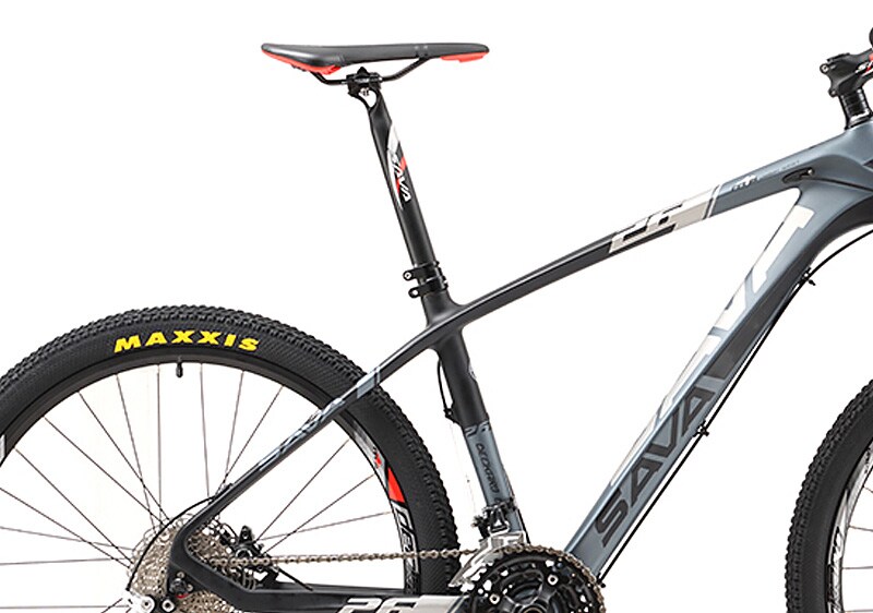 軽量カーボンマウンテンバイクにシマノ製DEORE 30段変速、前後油圧式ディスクブレーキを搭載し、フロント油圧式サスペンションの充実スペック。
