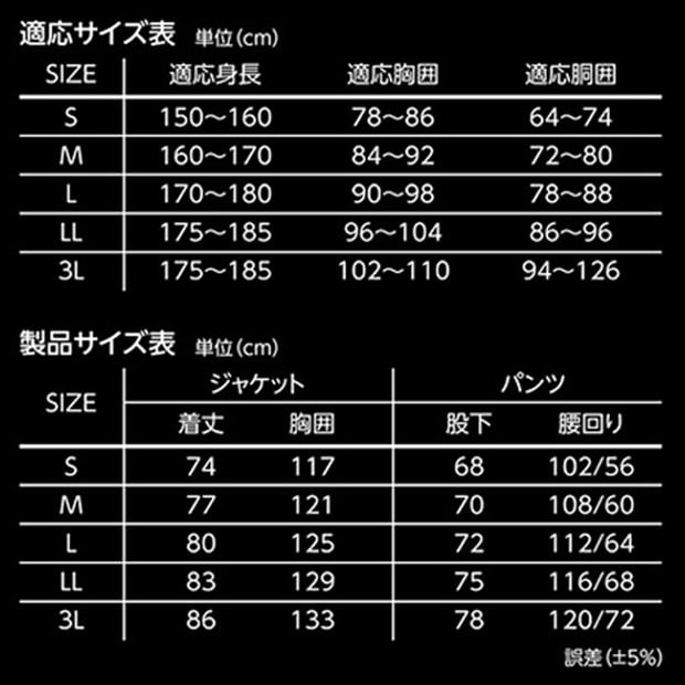 | 適応身長 | 適応胸囲 | 適応胴囲 |