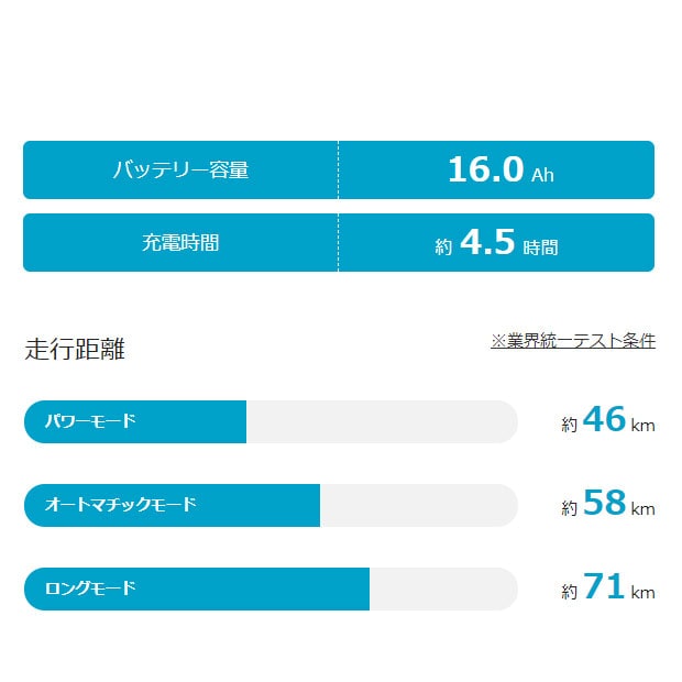 | 充電1回の走行距離(標準パターン) | パワーモード:約46km オートマチックモード:約58km ロングモード:約71km |