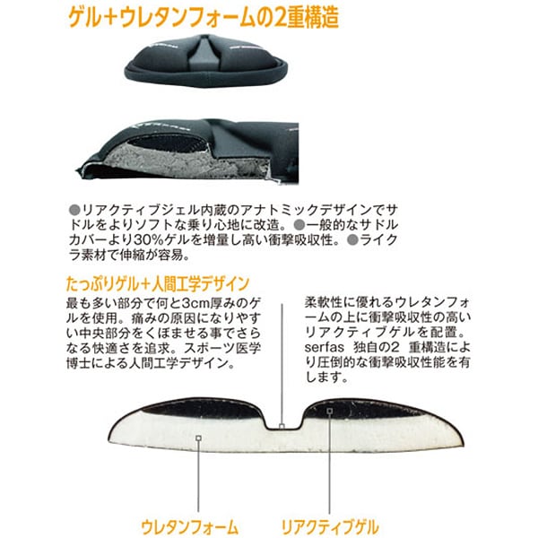 柔軟性に優れるウレタンフォームの上に衝撃吸収性の高いリアクティブゲルを配置。serfas独自の2重構造により圧倒的な衝撃吸収性能を有します。
