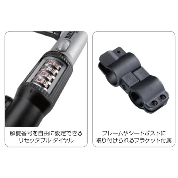 4ケタのコンビネーションダイヤルで施錠/解錠するスチール製Uロック。解錠番号を自由に設定できるリセッタブルダイヤルを採用。