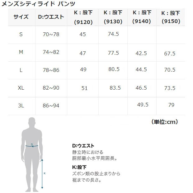 | D:ウエスト | K:股下(9120) | K:股下(9130) | K:股下(9140) | K:股下(9150) |