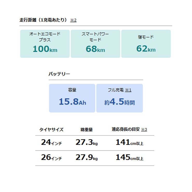 | 一充電走行距離(注1) | 強モード:62km スマートパワーモード:68km オートエコモード:100km |
