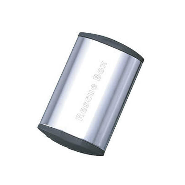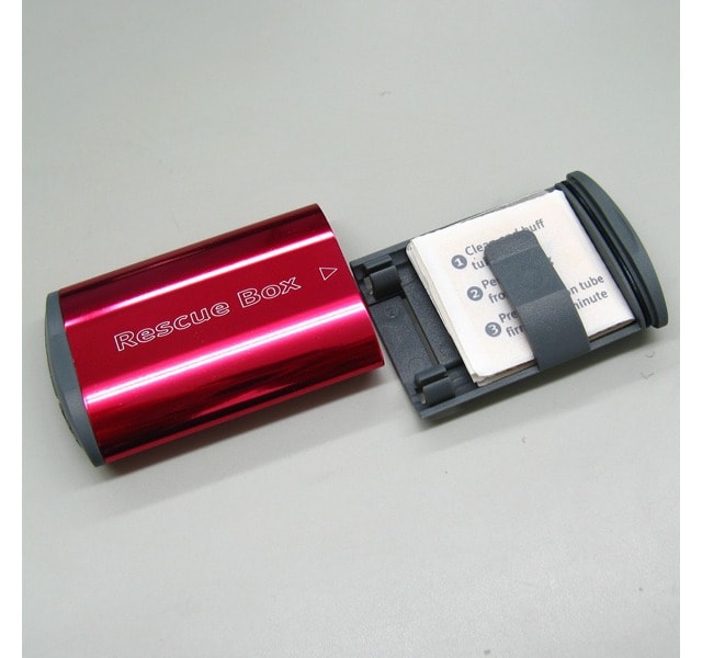 高圧に耐えるグルーレスパッチ6枚とサンドペーパー1枚が、フラットなアルミケースに入ったレスキューボックス