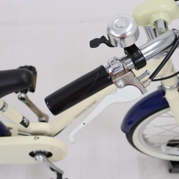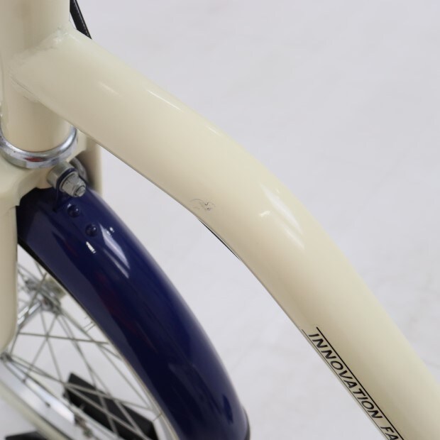 一部に傷や錆がありますが、比較的状態の良い車体です。前カゴ、前後泥除けが後付けされています。補助輪がスタンドに交換されています。前後チューブにパンク防止剤が注入されています。