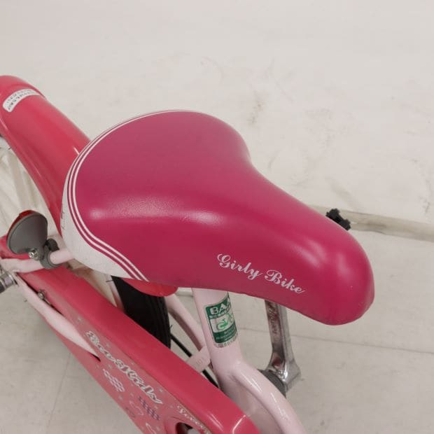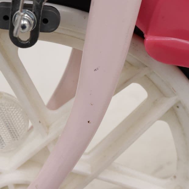 一部に傷や錆や汚れがありますが、比較的状態の良い車体です。補助輪がスタンドに交換されています。ハンドルバッグ欠損。