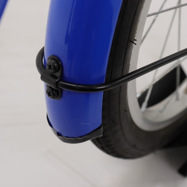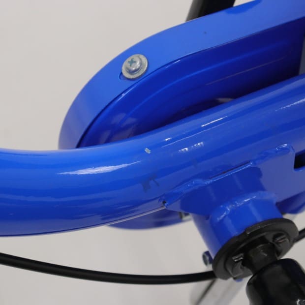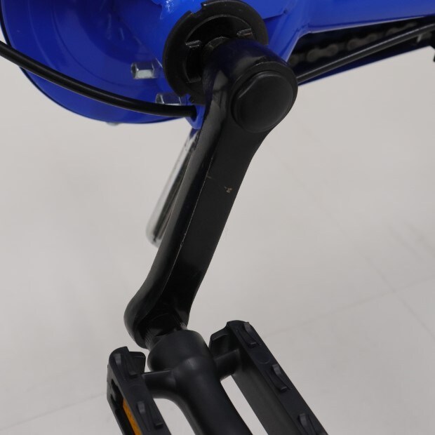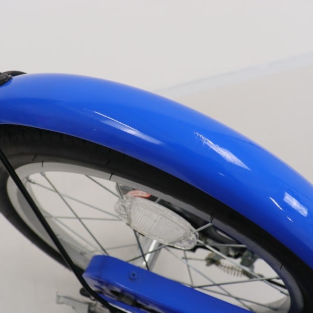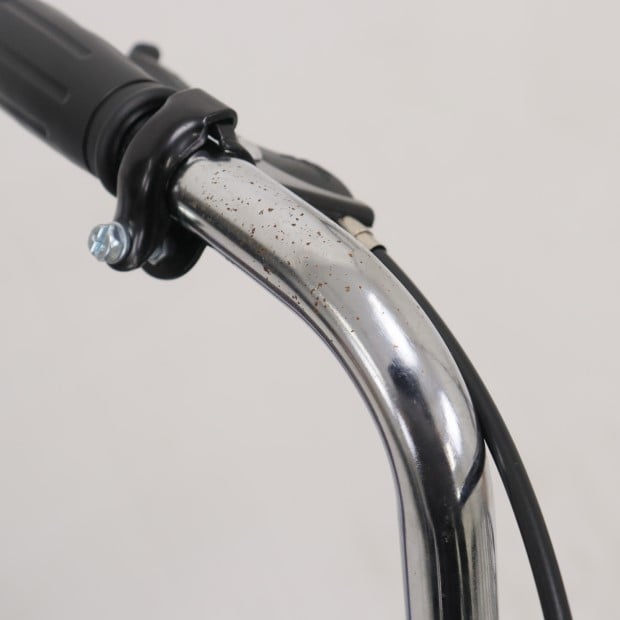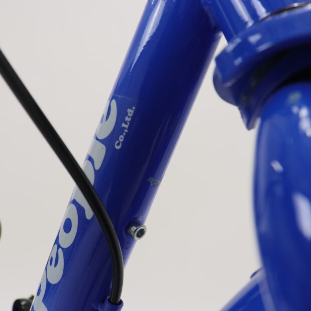 一部に傷がありますが、比較的状態の良い車体です。補助輪が両立スタンドに交換されています。かじ取り棒欠損。