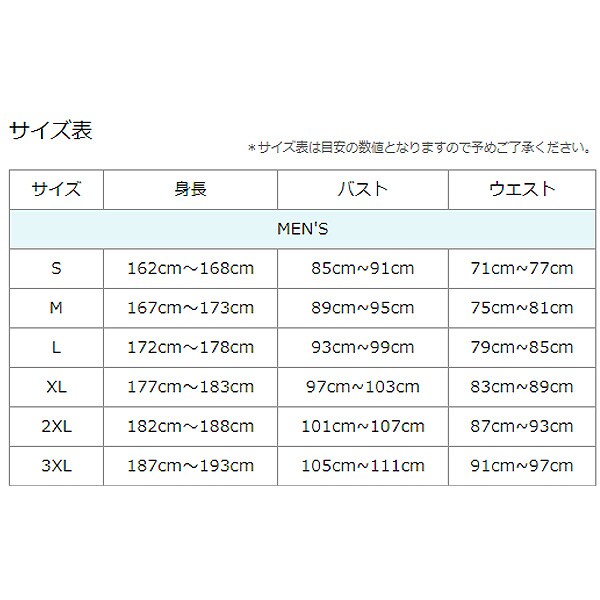 | 3XL | 187cm〜193cm | 105cm~111cm | 91cm~97cm |