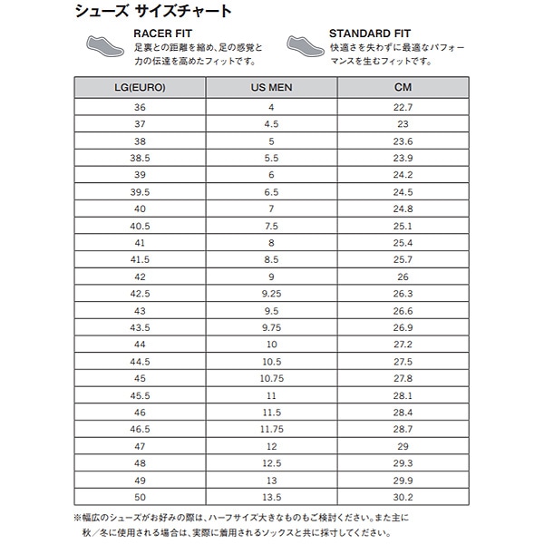 ※幅広のシューズがお好みの際は、ハーフサイズ大きなものもご検討ください。また主に秋/冬に使用される場合は、実際に着用されるソックスと共に採寸してください。