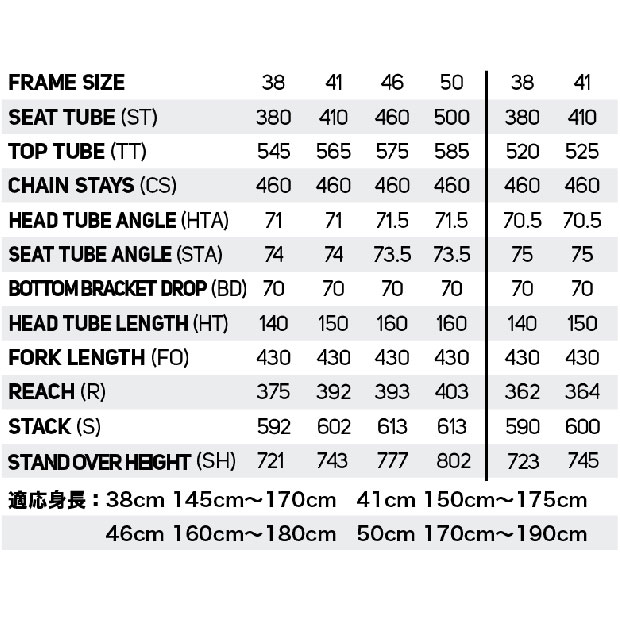 | 適応身長 | 145~170cm(38cm) 150~175cm(41cm) 160~180cm(46cm) 170~190cm(50cm) |