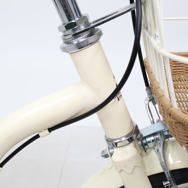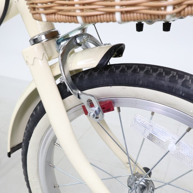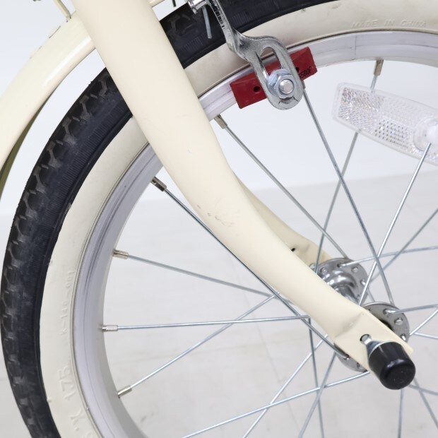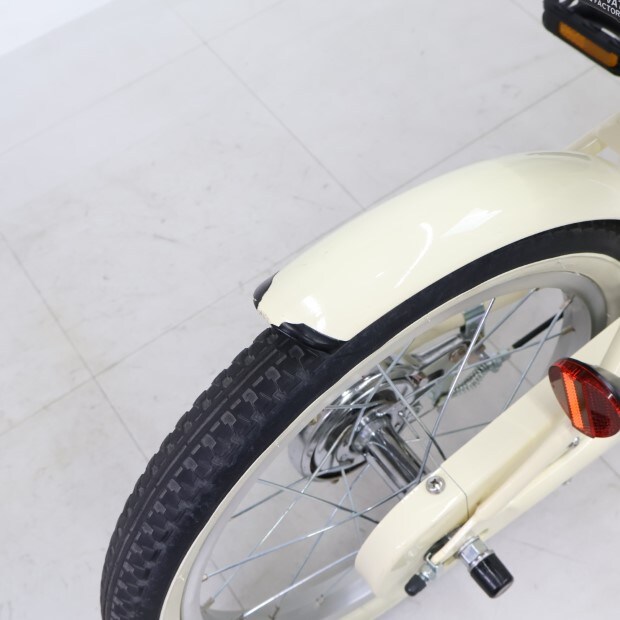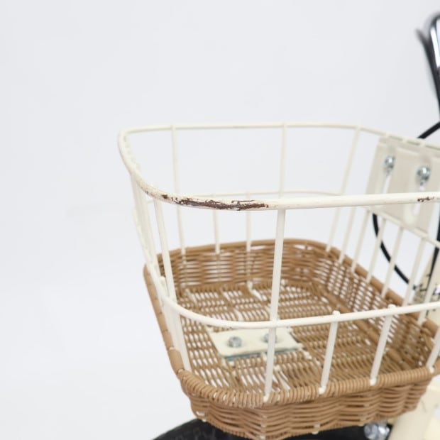 一部に傷や錆やスレがありますが、比較的状態の良い車体です。ステムキャップ欠損。補助輪がスタンドに交換されています。前カゴ、前後泥除けが後付けされています。