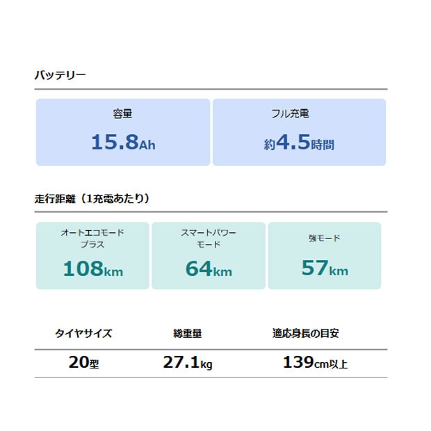 | 一充電走行距離?(注2) | 強モード:57km スマートパワーモード:64km オートエコモード:108km |