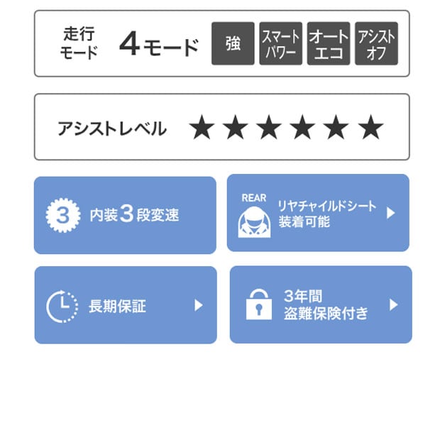電動アシスト自転車にとって、とても重要な構成部品であるバッテリー、ドライブユニット、フレーム・フロントフォークが長い期間、より快適にご使用いただける安心の長期保証です。
