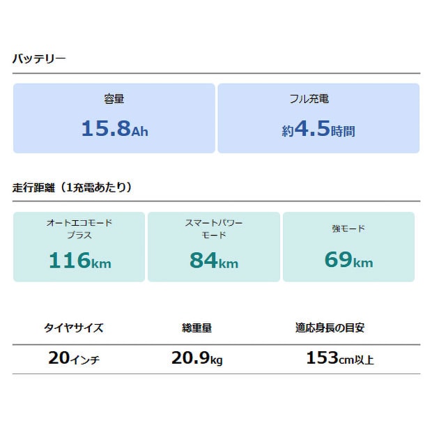 | 一充電走行距離?(注2) | 強モード:69km スマートパワーモード:84km オートエコモード:116km |