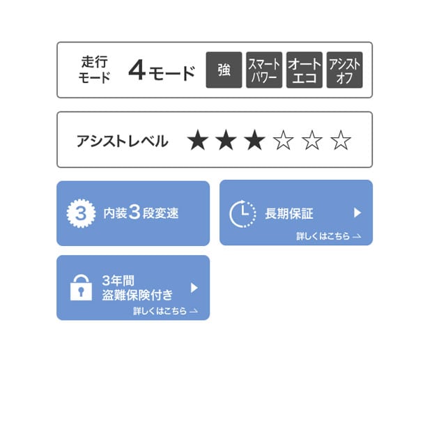 電動アシスト自転車にとって、とても重要な構成部品であるバッテリー、ドライブユニット、フレーム・フロントフォークが長い期間、より快適にご使用いただける安心の長期保証です。